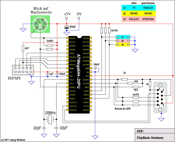 Solange nur TV-out benutzt werden soll und eine grüne Darstellung nicht stört, muss an der ChipBasic2 Hardware nichts geändert werden. Für eine Schwarz-Weiss-Darstellung müssen PORTC.5, PORTC.6 und PORTC.7 gebrückt werden. Wenn auch LCD-Ausgabe genutzt werden soll, darf die 16-Farb-Erweiterung nicht installiert sein, da ansonsten bei offenem Jumper nicht mehr sicher 1-Pegel erkannt wird und dann eine Umschaltung auf TV-Out nicht mehr funtioniert. Die beiden 2K2 Widerstände an den Tastaturleitungen sollen Probleme mit einigen Tastaturen (insbesondere die mit USB-PS2 Adapter) beseitigen.