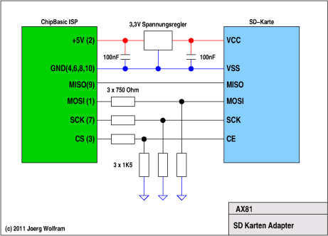 Die nachfolgende Beschaltung für eine SD-Karte benutzt einen eigenen Spannungsregler zur Erzeugung der 3,3V Betriebsspannung und Spannungsteiler zur Pegelanpassung. Das mag nicht unbedingt optimal sein, hat sich aber bei mir bewährt.